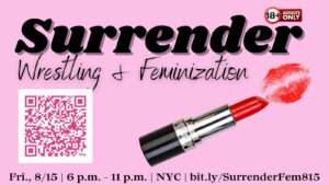 Katarina “The Domme Kat” Pierce returns to YKF to discuss her “Surrender: Wrestling & Feminization” party. We discuss the power of TRASH TALK, joint locks, blood chokes, snapping pantyhose, bondage wrestling, suspending sissies, and a gay girl’s dream.